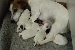 Há duas semanas a Jackie estava com esta barriga enorme, quase quase quase a ter bébes, e não faziamos a mínima ideia quantos eram! Estava com esperanças de assistir ao meu primeiro parto canino, mas a Jackie atrasou-se umas quantas horas e teve os bébes durante a madrugada.